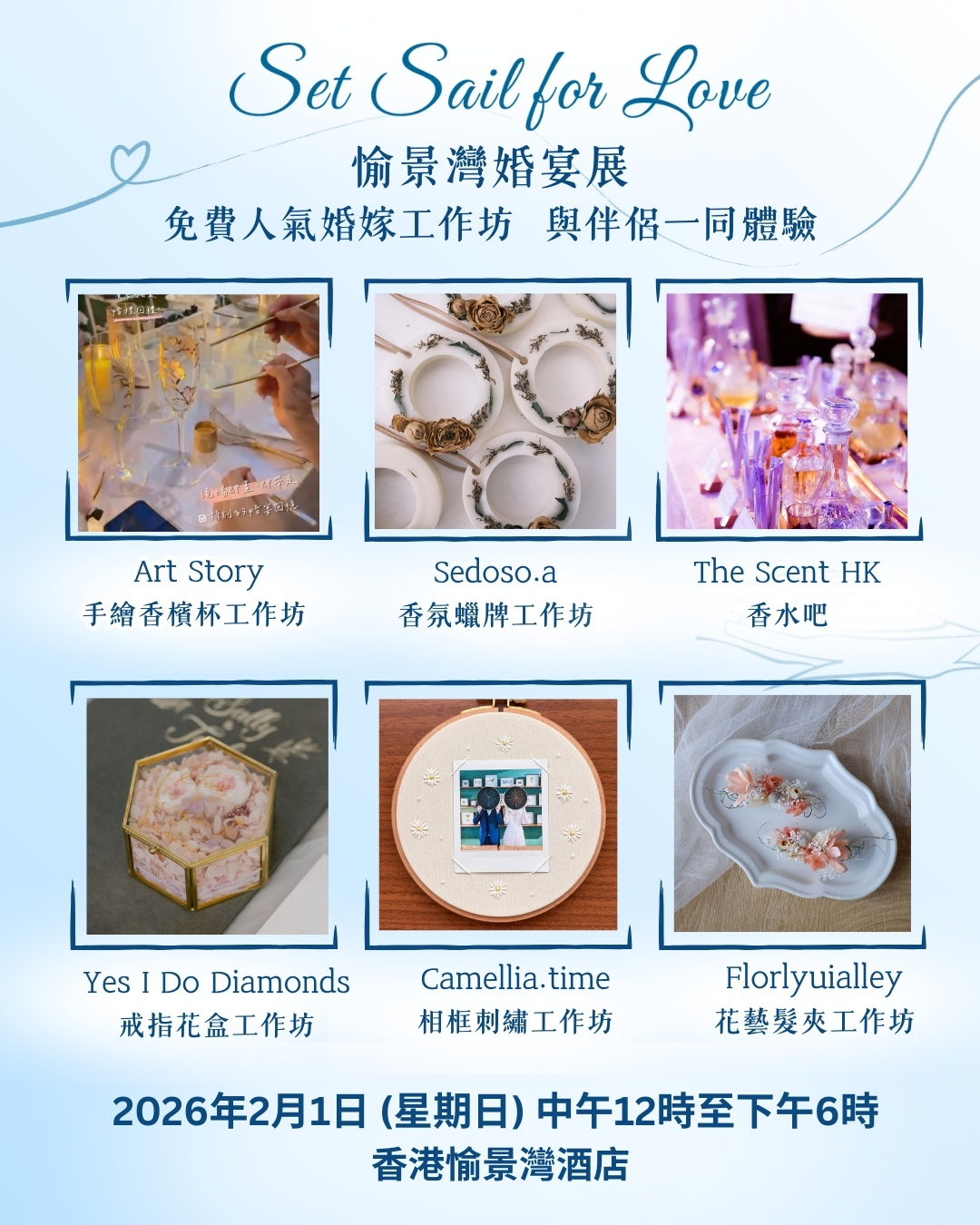 2026 年 2 月 1 日(星期日),《SET SAIL FOR LOVE 愉景灣婚宴展》誠邀準新人踏上一趟輕鬆浪漫的備婚旅程,一次過參觀島上多個特色婚禮場地。由純白典雅的海濱禮堂、無柱高樓底的宴會廳、飽覽遼闊海景的海嵐廳,以至綠意盎然的臨海證婚草地,每一個場地都洋溢著外國度假式婚禮的浪漫氣氛。